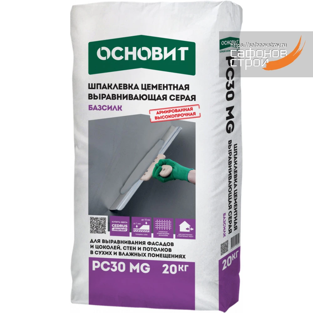 - Шпаклевка цементная Основит Базсилк PС30 MG предназначена для выравнивания стен и потолков внутри и снаружи зданий, для ремонта кладочных швов, оконных откосов, локальных ремонтных работ.