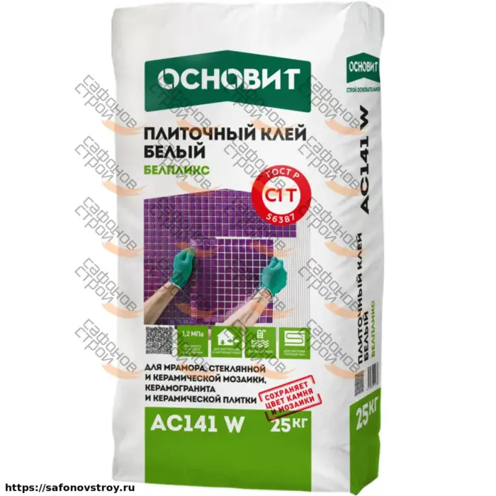 Белый плиточный клей для облицовки стен и пола плитами из мрамора, цветной и прозрачной стеклянной плиткой, декоративной мозаикой, стекло-блоками, гранитом, натуральным и искусственным камнем. (весом до 800 г/100 см2). Класс C1 T.