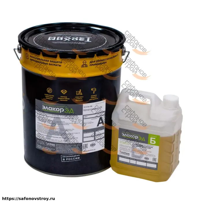 Элакор-ЭД Шпатлёвка — Двухкомпонентная эпоксидная шпатлёвка цветная. Используется для заделки мелких и крупных дефектов бетонной поверхности. Не имеет в составе растворитель. После полимеризации образует высокопрочный химстойкий полимер. Расход на 1 мм толщины 1 кг/м2.