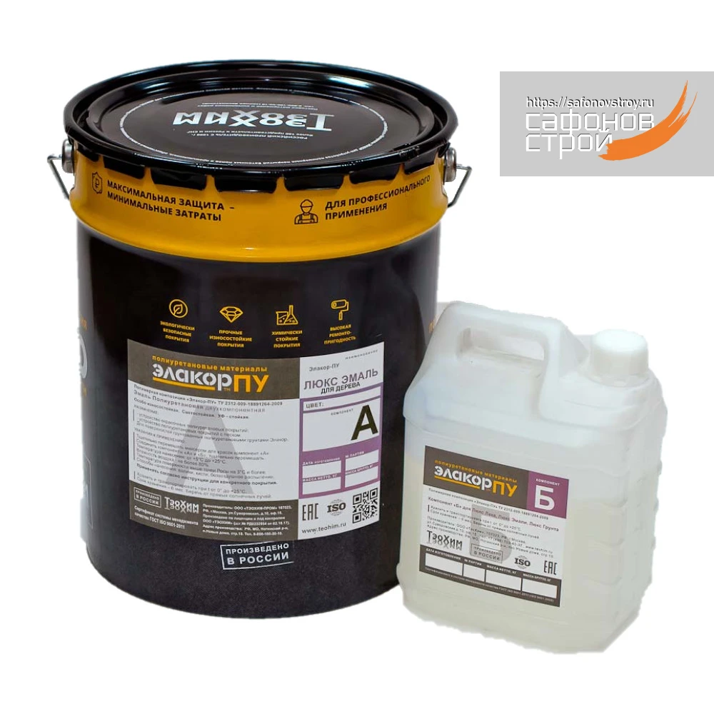 — Элакор-ПУ Люкс Эмаль для Дерева – двухкомпонентный материал, для начала полимеризации необходимо смешать основу с отвердителем. Соотношение компонентов – А:Б = 6:1 (контролировать на этикетке товара). Если будет использован целый комплект, взвешивание не требуется, в комплекте материалы дозированы.