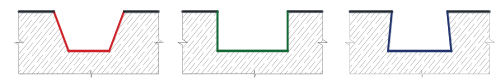 Красное – неправильное устройство штрабы, Зелёное – правильное утроство штрабы, Синее – наилучшее устройство штрабы методом ласточкин хвост.
