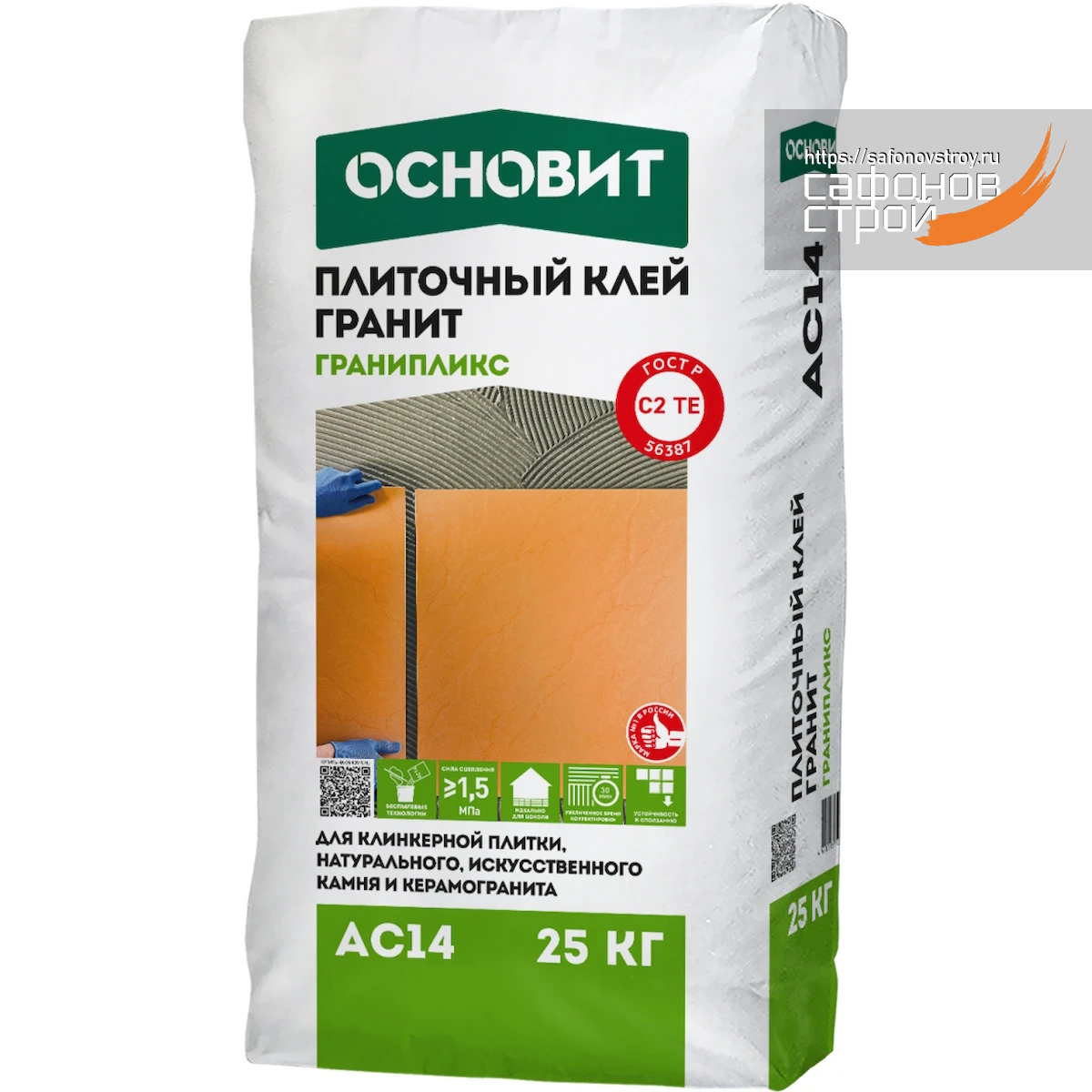 Продукт: Основит ГРАНИПЛИКС AC14 — усиленный плиточный клей для керамогранита, искусственного и натурального камня.