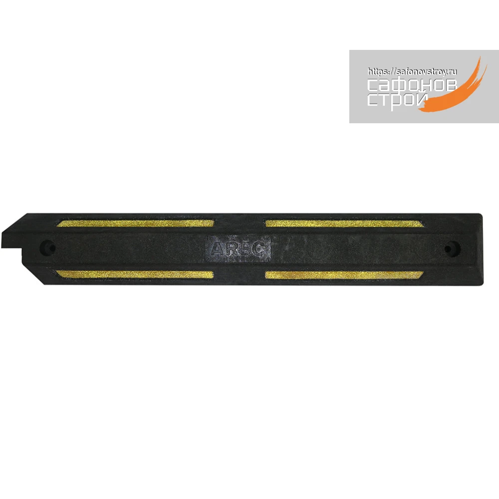Одна часть из двух сборного колёсоотбойника изготовлена из прочного композитного материала чёрного цвета со встроенными светоотражающими элементами желтого цвета. Колёсоотбойник предназначен для безопасного ограничения движения транспортных средств в зонах стоянки автомобилей. Длина одной части составляет 1000 мм. Соответствует требованиям СТО 64311476-002-2015.
