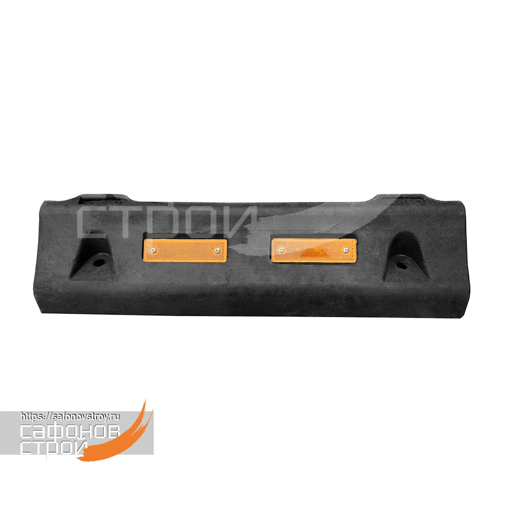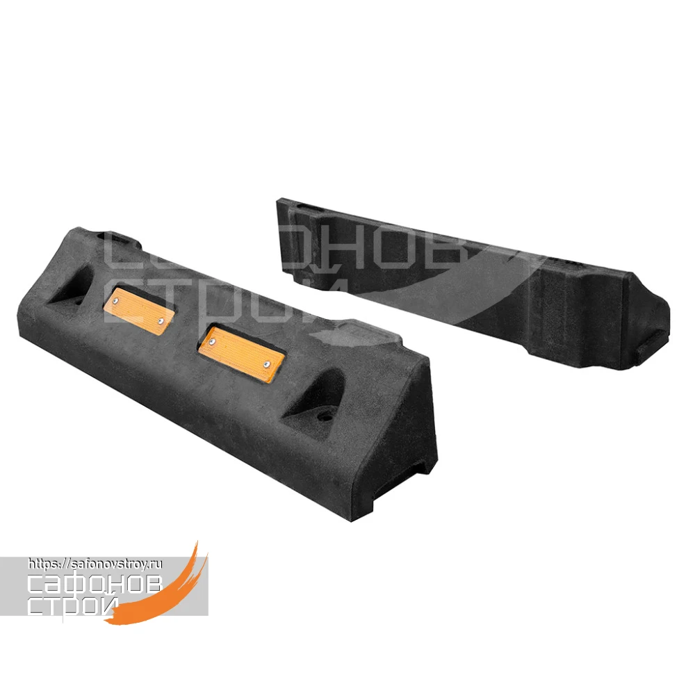 Колёсоотбойник изготовлен из прочного композитного материала чёрного цвета со встроенными светоотражающими элементами желтого цвета. Колёсоотбойник предназначен для безопасного ограничения движения транспортных средств в зонах стоянки автомобилей. Длина секции составляет 500 мм. Возможно соединение секций между собой для устройства непрерывного колёсоотбойника. Соответствует требованиям СТО 64311476-002-2015.