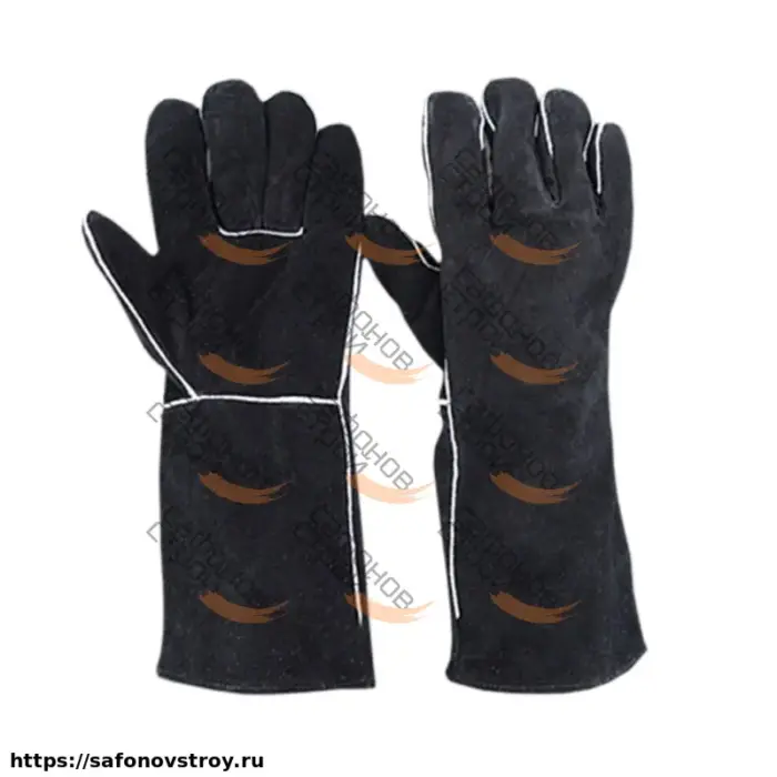 Из чёрного спилка А+ класса, прошиты Кевларовой (огнестойкой нитью), расширенный раструб позволяет заправлять внутрь краги спецодежду.