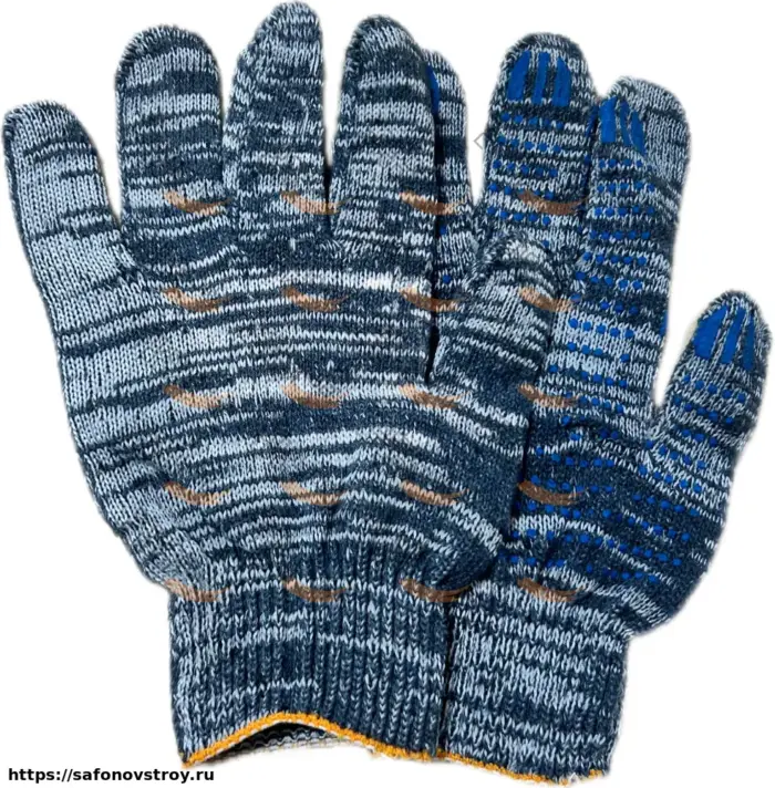 Перчатки вязаные х/б, с ПВХ-покрытием (точка) для предотвращения скольжения, 10 класса вязки. Используются для защиты рук от механических воздействий и общих загрязнений.