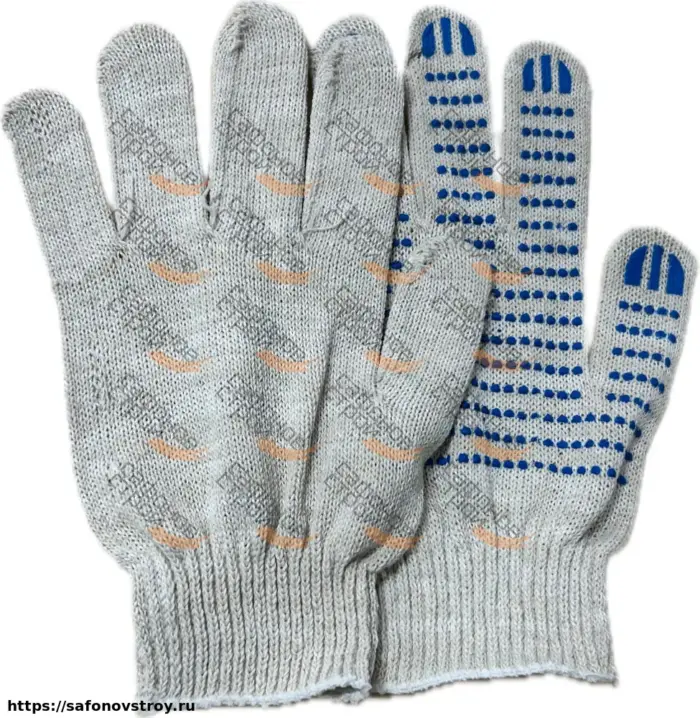 Перчатки вязаные х/б, с ПВХ-покрытием (точка) для предотвращения скольжения, 10 класса вязки. Используются для защиты рук от механических воздействий и общих