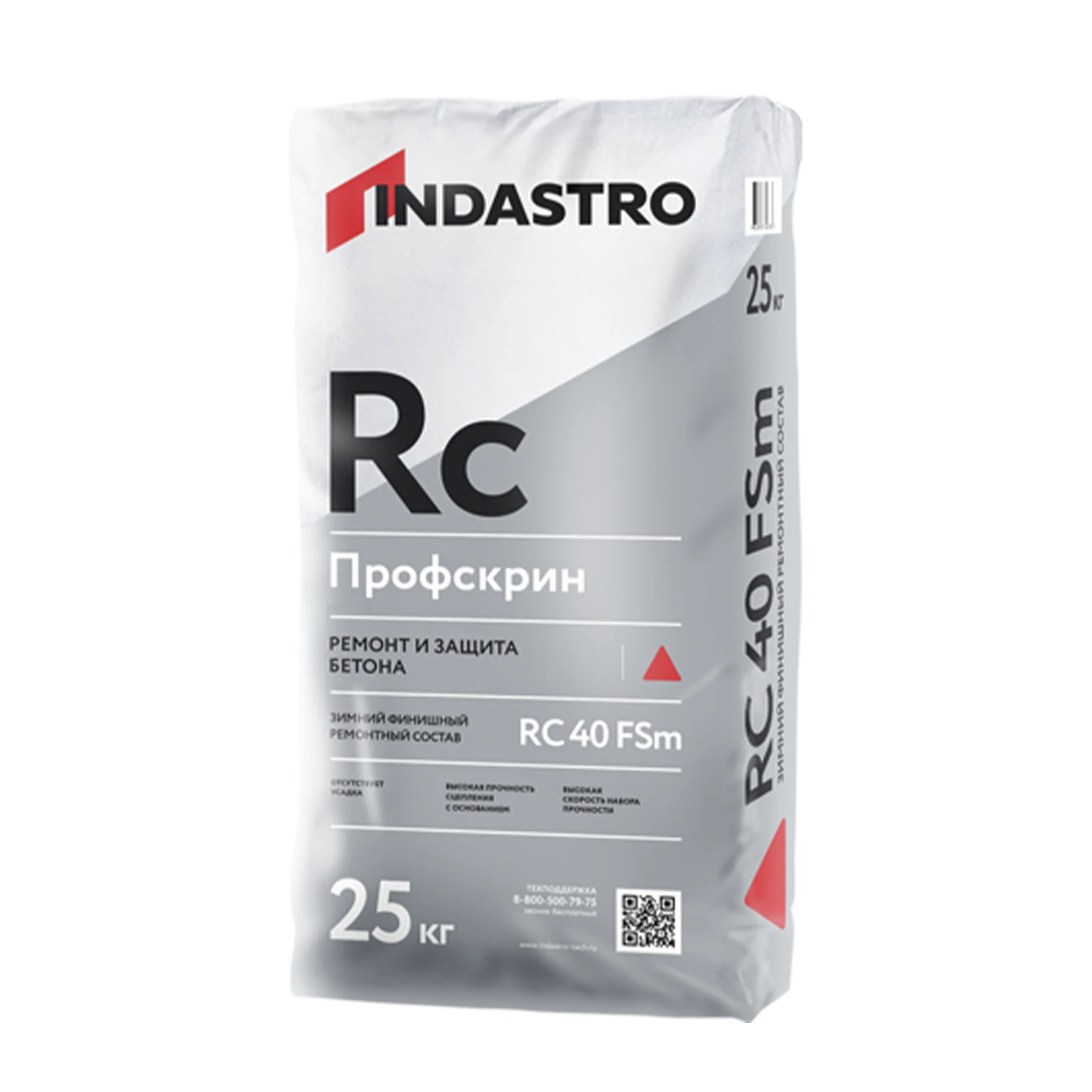 Индастро Профскрин RC40 FSm. Финишный ремонтный состав тиксотропного типа, предназначенный для чистовой отделки бетона и железобетона в зимнее время года при температуре от – 10° до + 10°С. Ремонтный состав Профскрин RC40 FSm – готовая к применению сухая растворная смесь, армированная полимерной фиброй. При смешивании с водой образует тиксотропный не расслаивающийся раствор с высокой адгезией к бетонным и стальным основаниям. Расход от 2 кг/м2 при слое 1 мм.