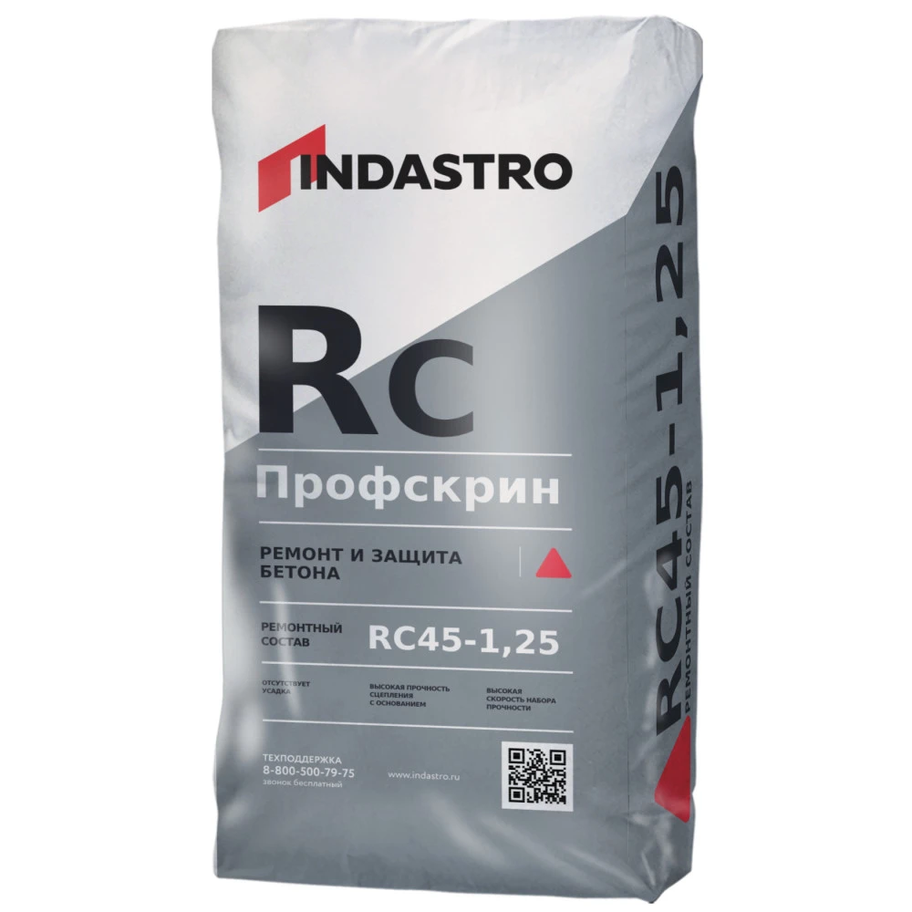 Индастро Профскрин RC45-1.25. Безусадочный быстротвердеющий ремонтный состав тиксотропного типа, предназначенный для конструкционного ремонта бетона и железобетона. Ремонтный состав Профскрин RC45-1.25 – готовая к применению сухая растворная смесь, армированная полимерной фиброй. При смешивании с водой образует тиксотропный не расслаивающийся раствор с высокой адгезией к бетонным и стальным основаниям. Расход от 2 кг/м2 при слое 1 мм.