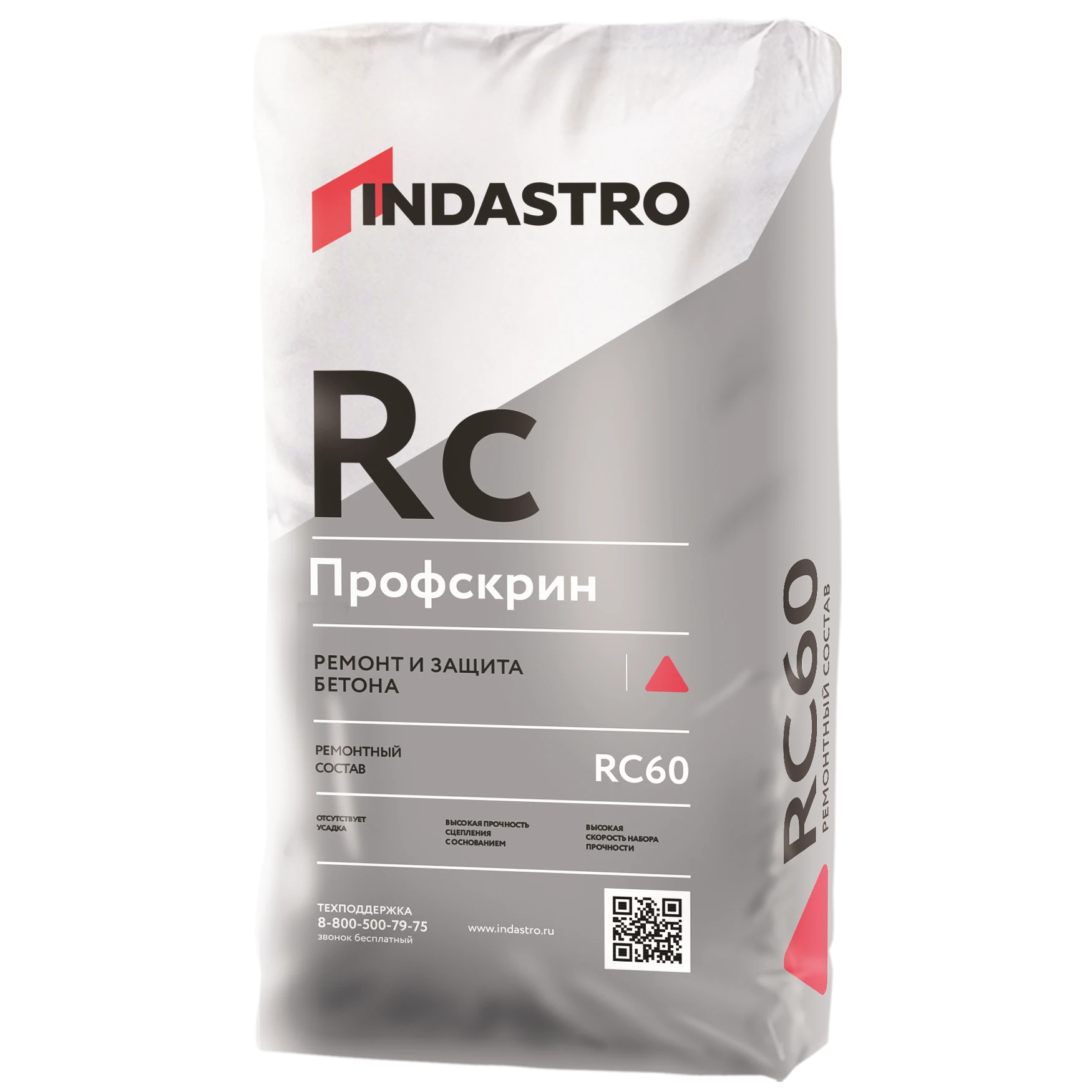 Индастро Профскрин RC60. Безусадочный ремонтный состав тиксотропного типа, предназначенный для конструкционного ремонта бетона и железобетона классов B40-B60. Ремонтный состав Профскрин RC60 – сухая растворная смесь, изготовленная на основе портландцемента, фракционированного песка, полимерной фибры и модифицирующих добавок. После затворения водой образуется тиксотропный раствор для ручного или механизированного метода нанесения. Расход от 2 кг/м2 при слое 1 мм.