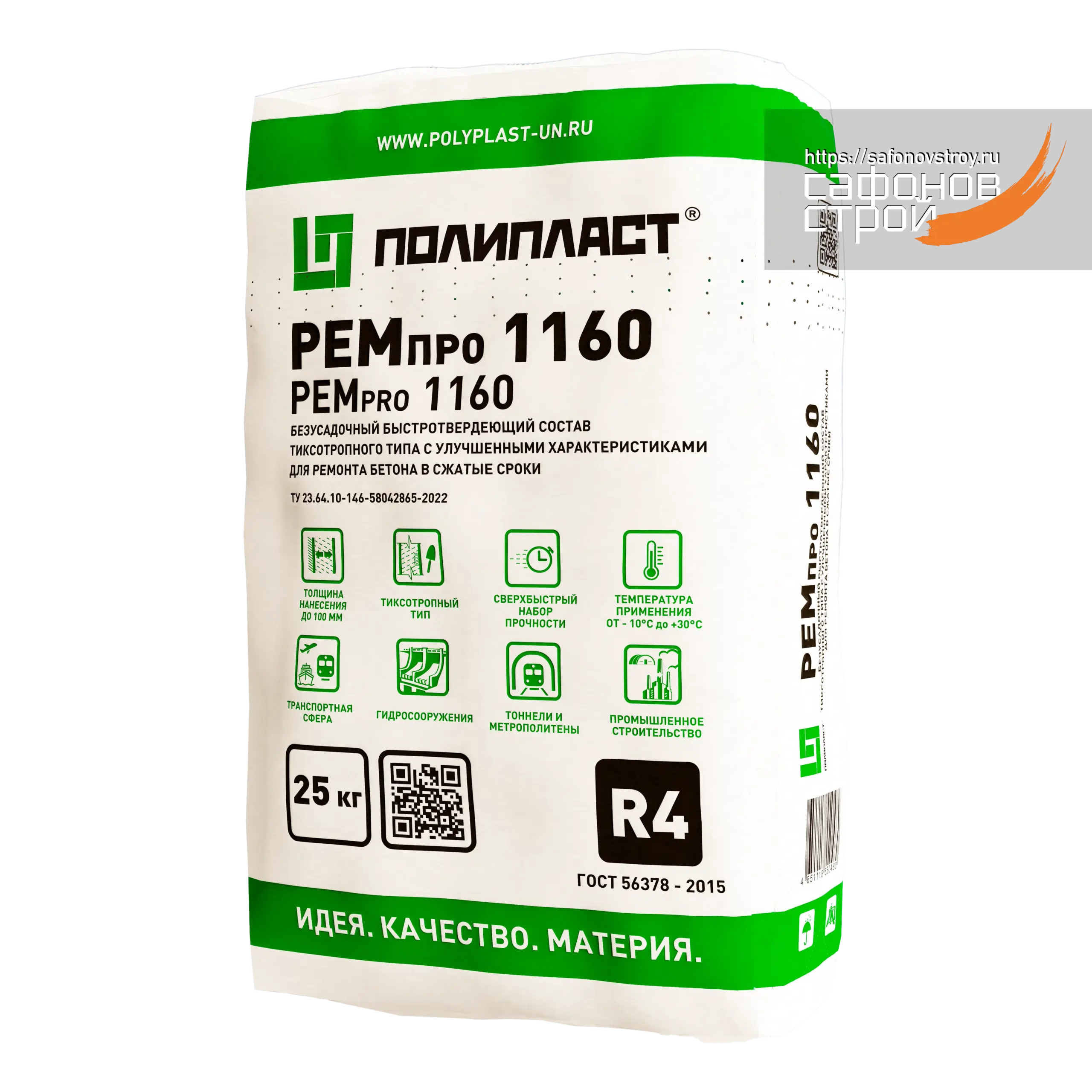 РЕМпро 1160 – быстротвердеющий ремонтный состав тиксотропный, гомогенный, безусадочный, реопластичный, легко наносимый на поверхность, применяемый для конструкционного ремонта бетона и железобетона без использования опалубки. Создан на основе высокопрочного цемента, фракционного песка, специальных добавок и гибкой неметаллической фибре. Полимерная фибра уменьшает риск растрескивания поверхности. Не содержит хлоридов и металлических заполнителей. Высокопрочный ремсостав применяется, когда необходим ранний набор прочности. Безусадочность ремонтного состава сохраняется как в пластичном, так и в твёрдом состоянии. Высокопрочный состав в затвердевшем состоянии обладает высокой морозостойкостью, водонепроницаемостью W16, отличной адгезией к основанию, устойчивостью к истиранию. Прочность на сжатие после 28 суток составляет 60 МПа. Толщина нанесения в один слой от 10 до 70 мм при температуре до +30°С. Температура применения от +5° до +30°С. Расход от 1900 кг/м3 или от 1,9 кг/м2 на 1 мм толщины