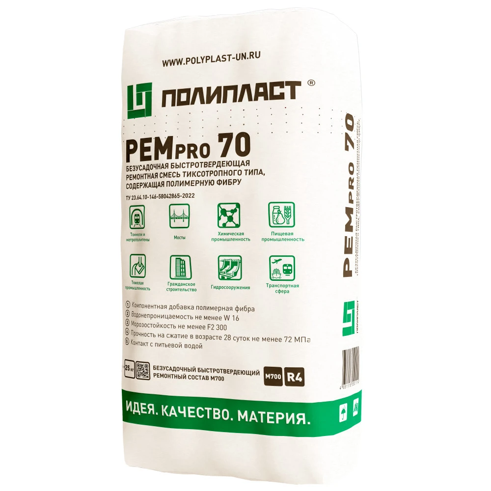 РЕМпро 70 — ремонтный материал, созданный на основе высокопрочного цемента, фракционированного песка и специальной добавки, содержащий полимерную фибру. После смешивания с водой образует реопластичный, тиксотропный гомогенный состав, легко наносимый на поверхность конструкций без применения опалубки. РЕМpro 70 является безусадочным, как в твердом, так и в пластичном состоянии. Не имеет металлических заполнителей и не содержит хлоридов. В затвердевшем состоянии представляет собой высокопрочный материал, обладающий высокой морозостойкостью и водонепроницаемостью, устойчивый к истиранию, и обладающий высокой адгезией к основанию. Толщина нанесения в один слой от 10 до 50 мм. Температура применения от +5°С и до +35°С.