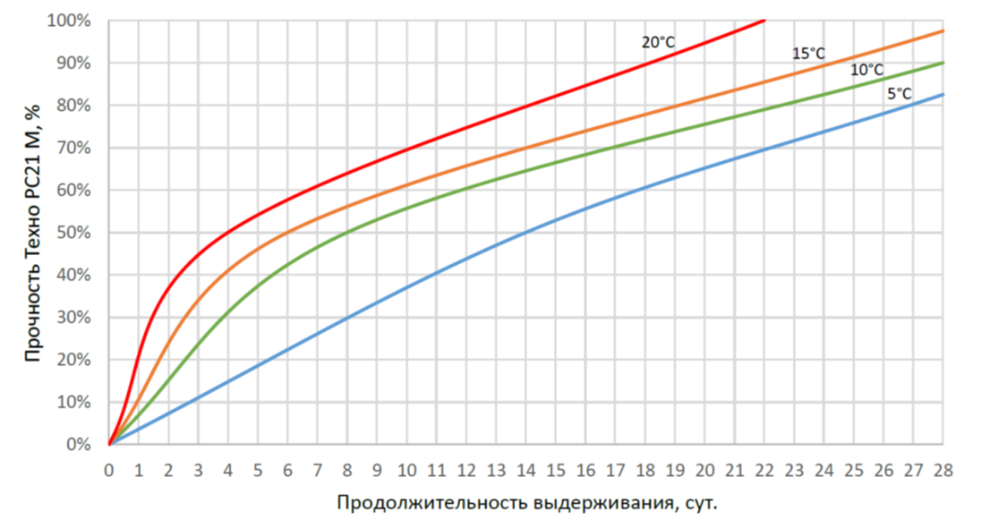Рис.1. Прочность цементной штукатурки Техно PC21 M в зависимости от температуры и продолжительности выдерживания.