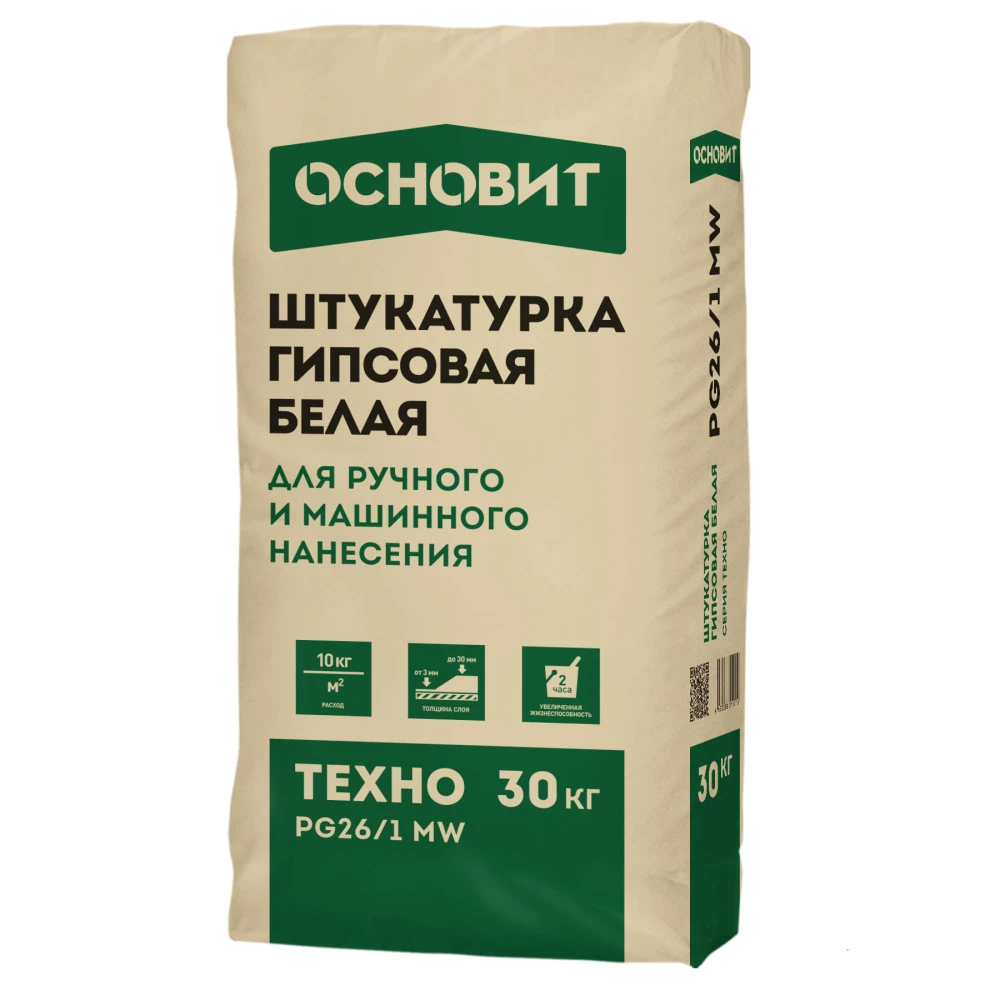 Штукатурка гипсовая белая Основит Техно PG26/1 MW предназначена для выравнивания стен и потолков в помещениях с нормальной влажностью под оклеивание обоями и окрашивание. Особенно рекомендуется для помещений общественного пользования, служебных, бытовых, жилых и помещений социального назначения, административных помещений