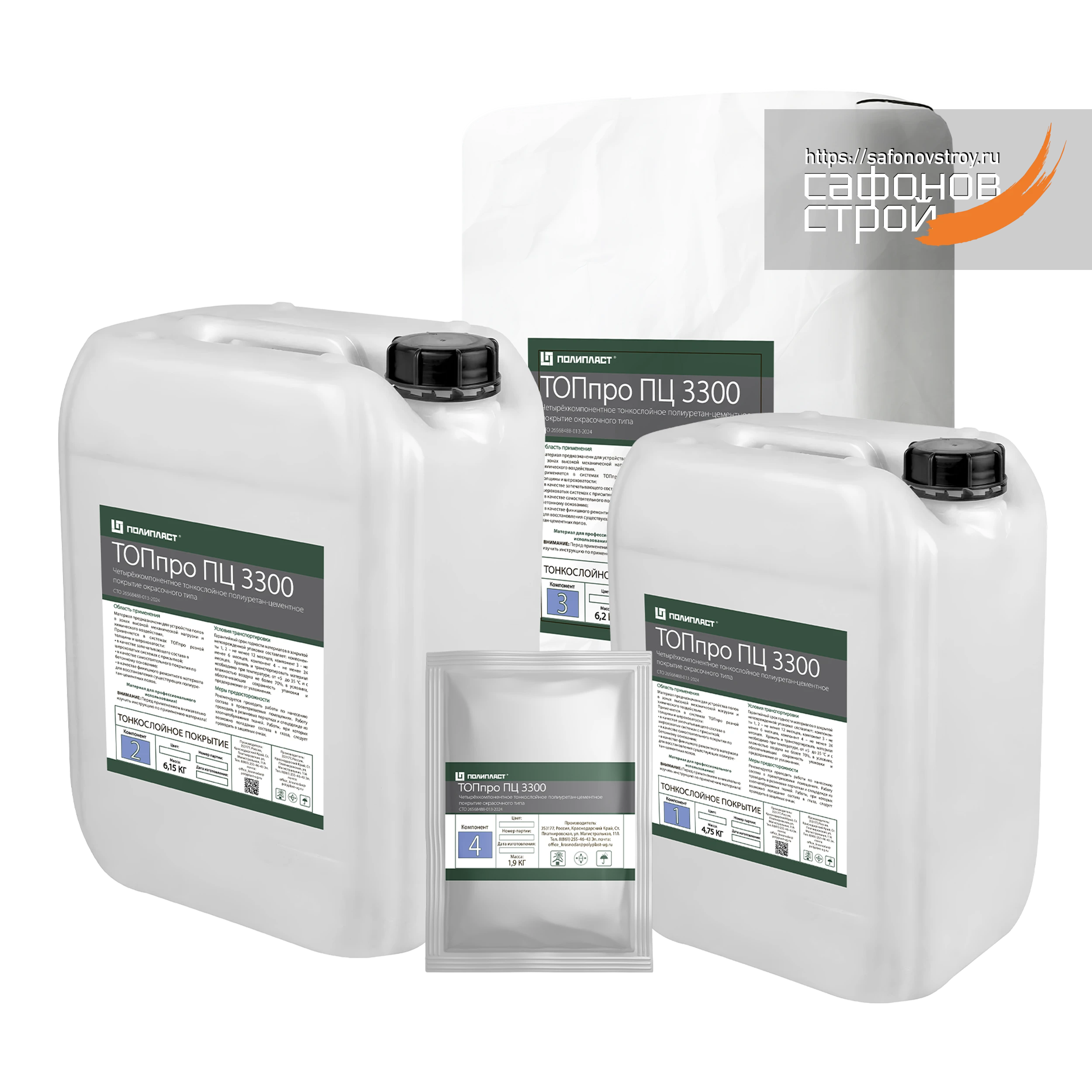 Фасовка: компонент А полиэтиленовая канистра 1 кг + компонент Б полиэтиленовая канистра 4.75 кг + компонент В бумажный мешок 1.3 кг + компонент Г саше-пакет 0.4 кг; итого комплект 4 кг.