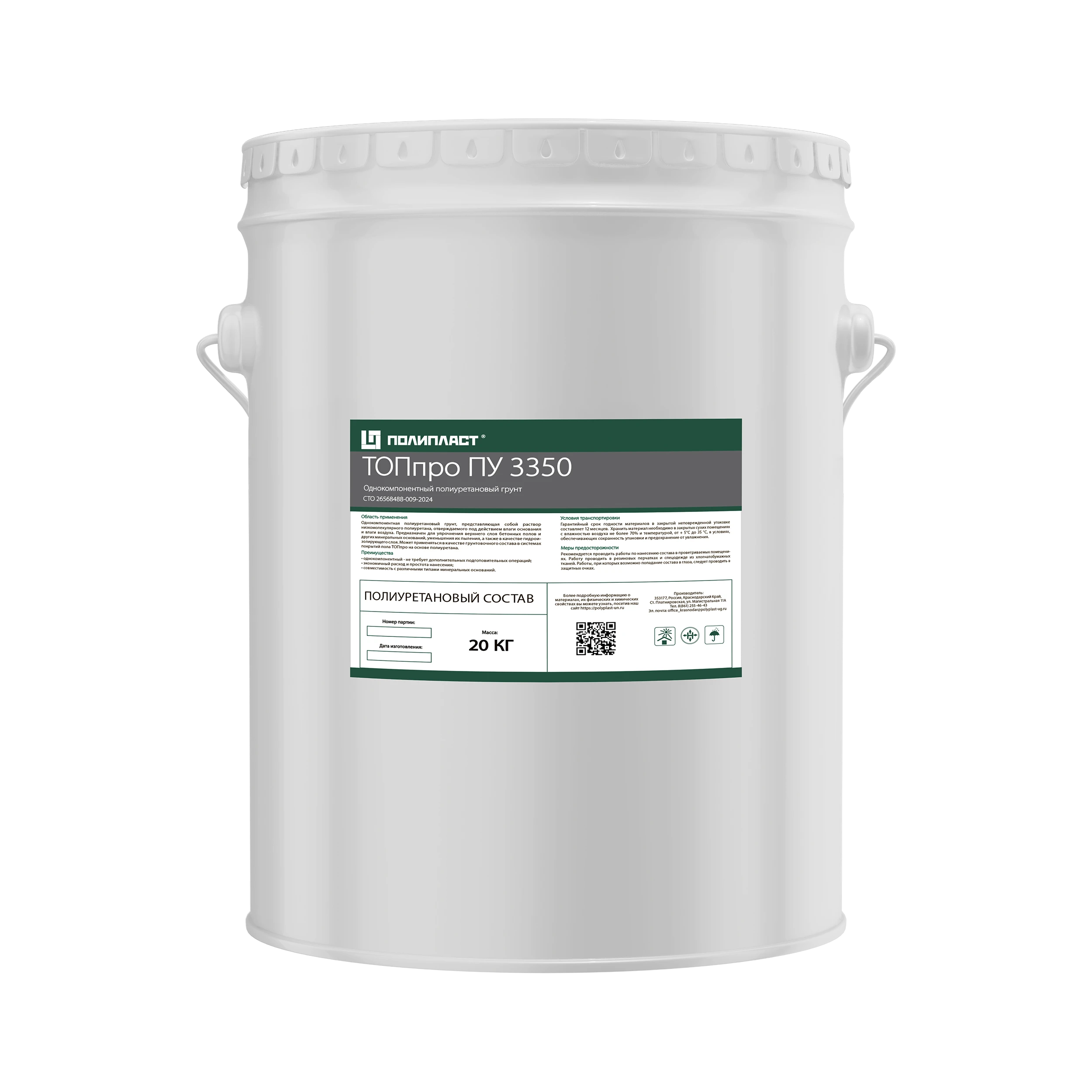ТОПпро ПУ 3350 — однокомпонентная полиуретановая грунтовка для бетона, представляющая собой раствор низкомолекулярного полиуретана, полимеризующегося под действием влаги основания и влаги воздуха. Предназначена для упрочнения верхнего слоя бетонных полов, уменьшения их пыления, а также в качестве гидроизолирующего слоя. Применяется в качестве грунтовки в системах покрытий пола ТОПпро на основе полиуретана. Расход от 0,3 кг/м2