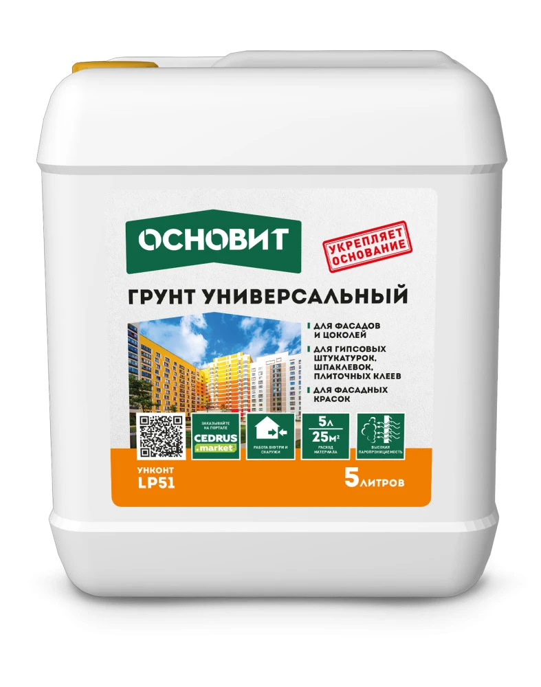 Универсальный грунт Основит Унконт LP51 предназначен для предварительной обработки и обеспыливания минеральных оснований. Применяется для подготовки поверхности под последующее нанесение отделочных материалов: штукатурок, шпаклёвок, плиточных клеев, красок. Особенно рекомендуется к применению в системах плиточной облицовки. Для внутренних работ.