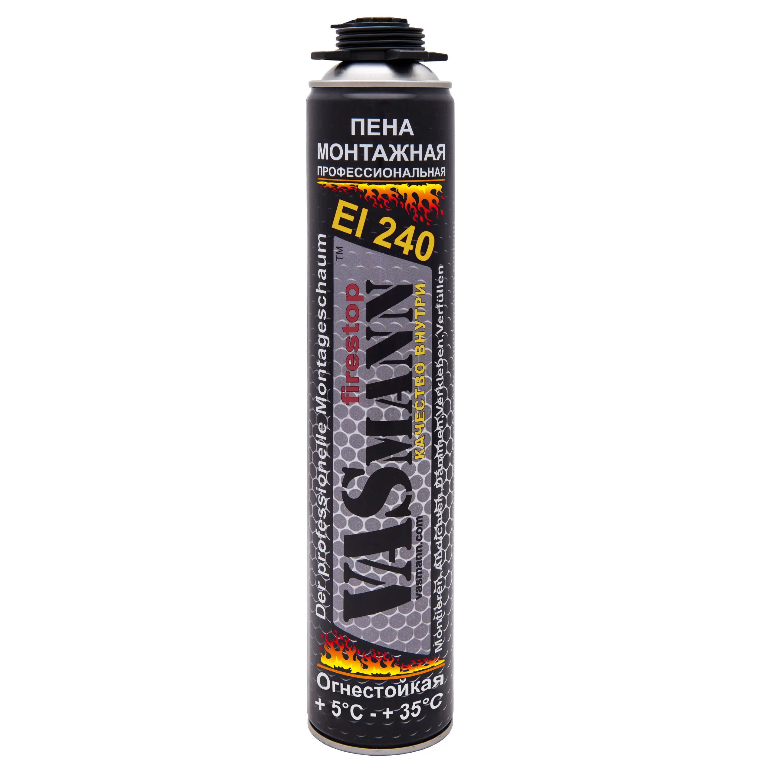 Огнестойкая монтажная пена VASmann firestop состоит из одного компонента. Продукт производится с использованием инновационных материалов, предотвращающих воспламенение. Не поддерживающая горение противопожарная пена имеет высокий уровень огнестойкости и отвечает нормам ТУ BY 809000487.005—2014. VASmann firestop соответствует классу B2 согласно требованиям европейских стандартов (DIN 4102–1). Предел огнестойкости — EI240.
